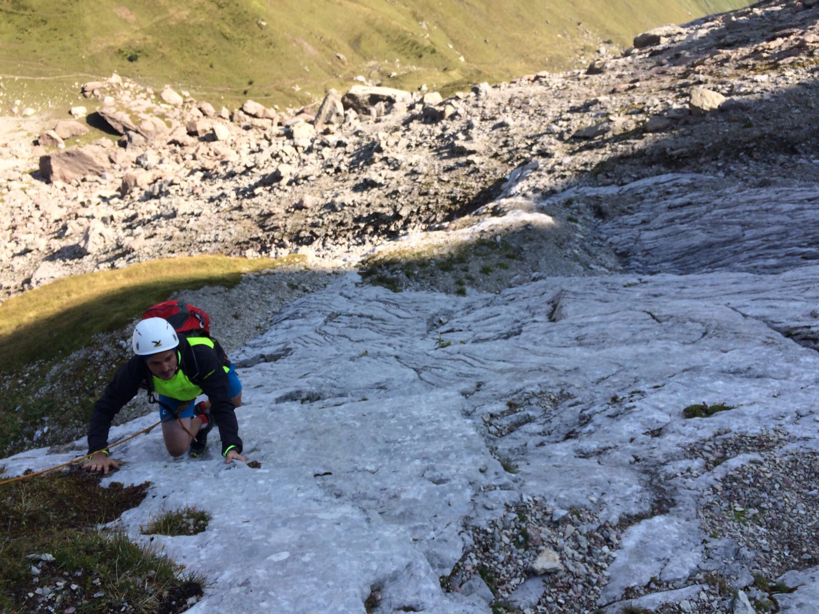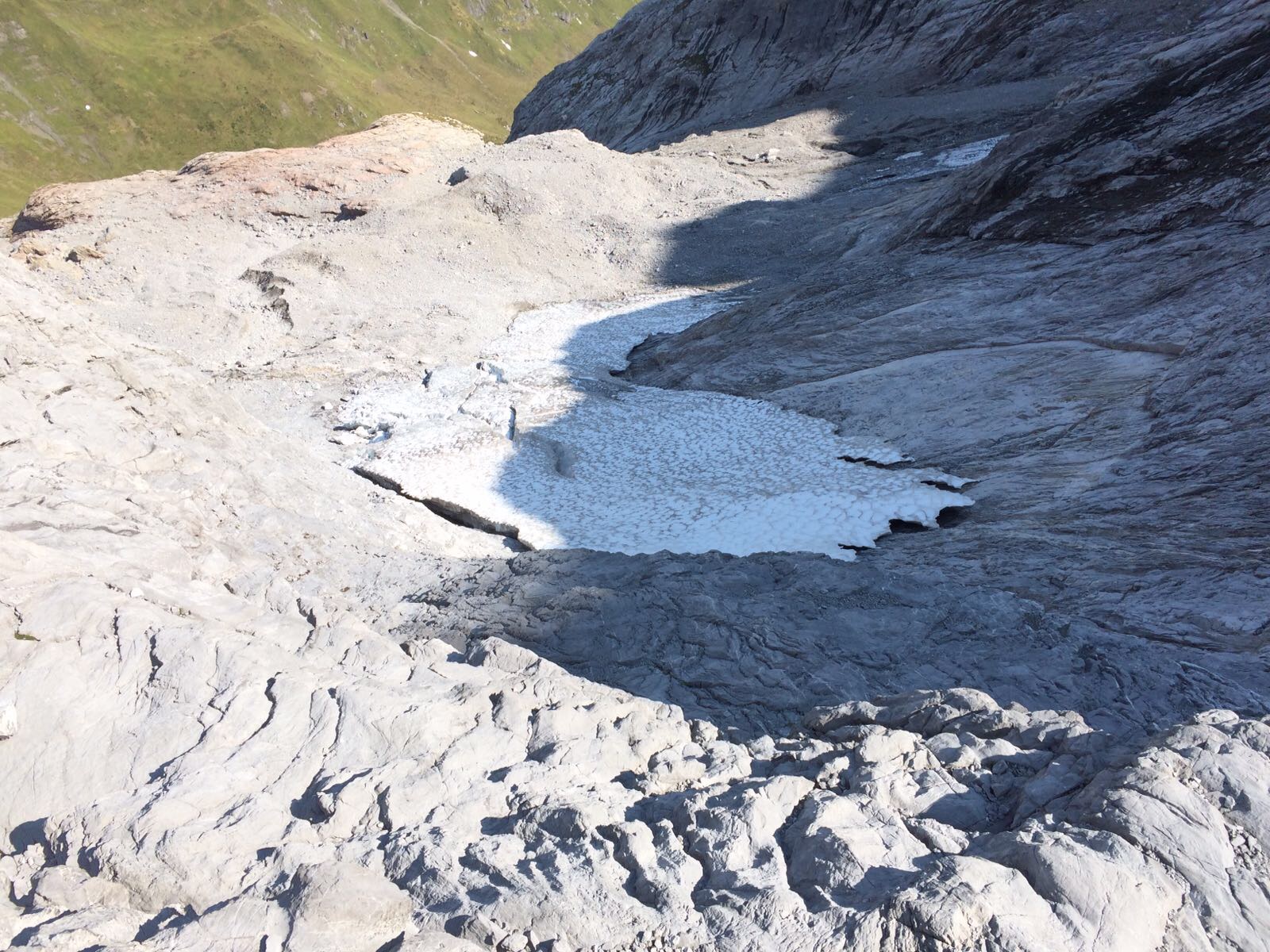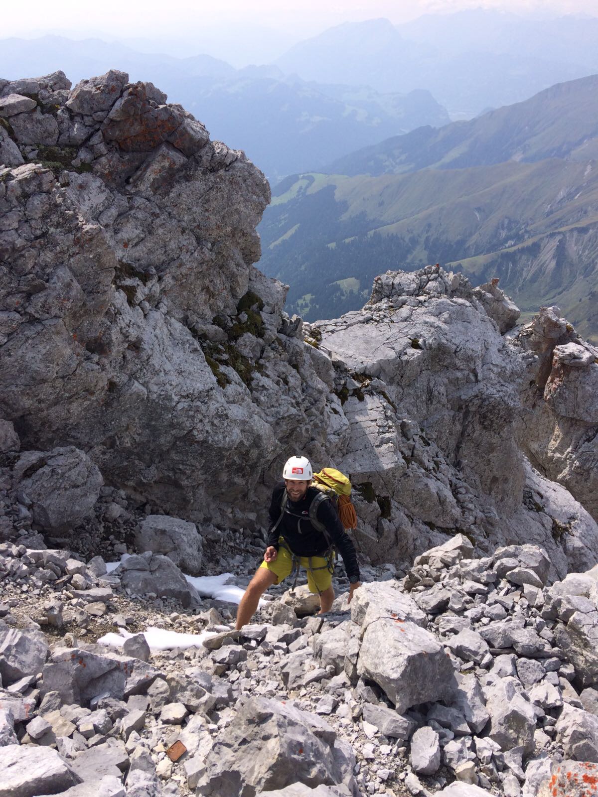 Mit dem Bike ging´s von Latschau vorbei an der Lindauer Hütte Richtung Öfenpass. Kurz das Bike deponieren und weiter zum Einstieg. Den Einstieg in die Imhofmulde konnten wir über den nicht markierten Weg rasch finden. Über grasig-felsiges Gelände ging es in leichter Kletterei steil aufwärts. Weiter oben öffnet sich ein großes Kar, welches noch Reste eines kleines Gletschers verbirgt. Unter dem Gletscher querend geht es anschliessend über stufiges Felsgelände Richtung Imhofsattel. Dort trifft sich unsere Route mit der Aufstiegsroute via Öfenpass. Über den Westgrat und Zudrellband zum Gipfel. Bei dieser Aufstiegsroute handelt es sich um die Route der Erstbesteigung im Jahre 1870 durch Christian Zudrell.