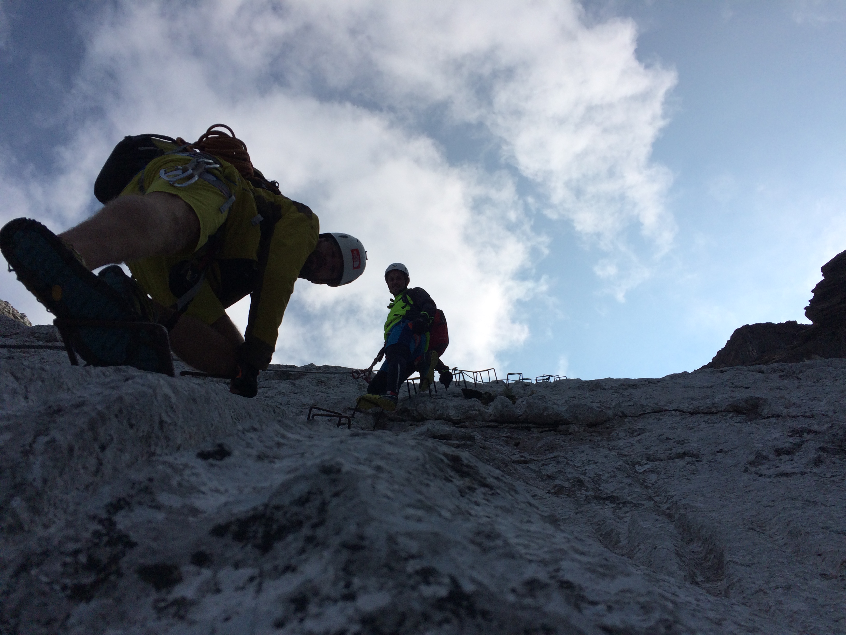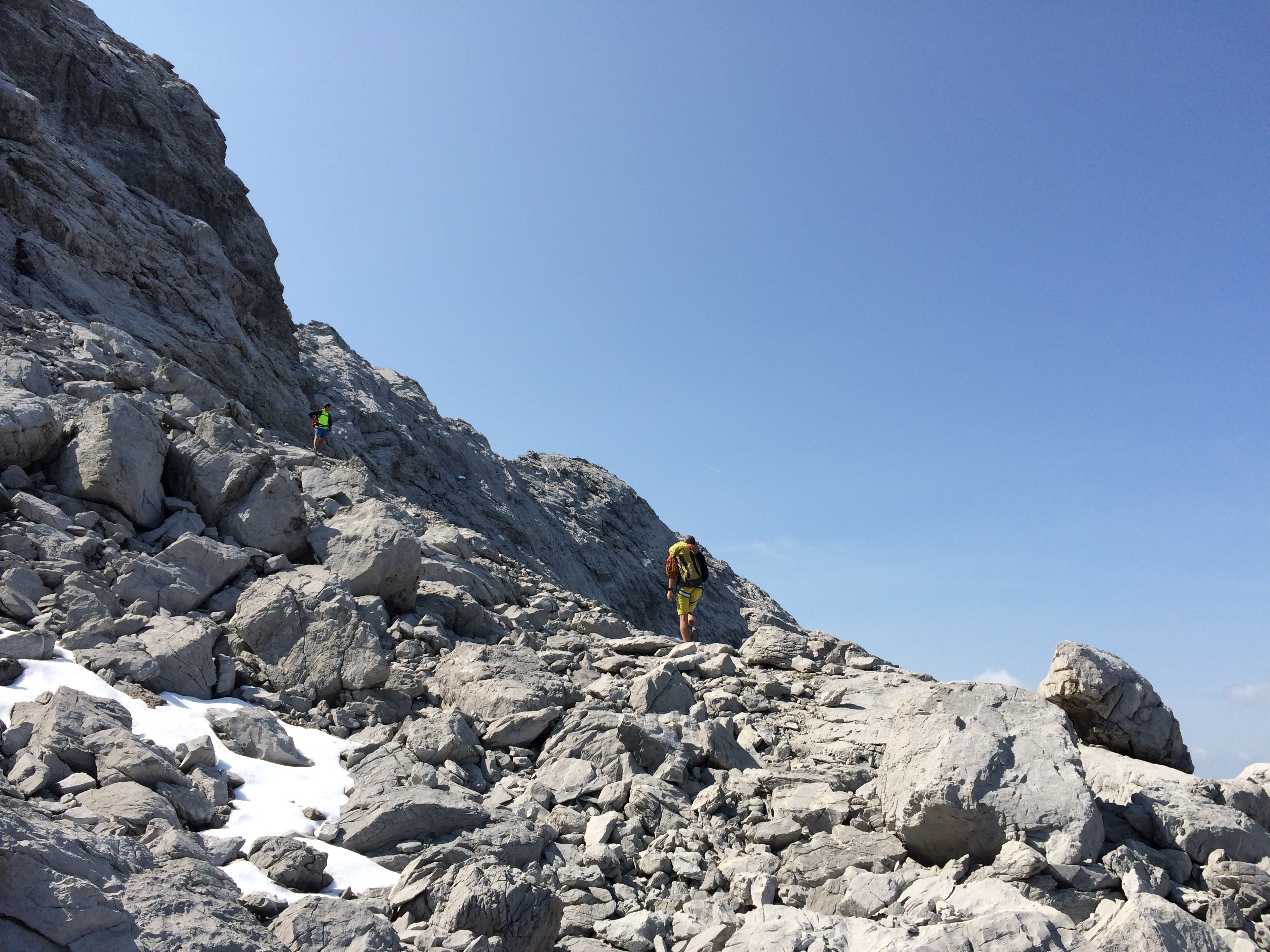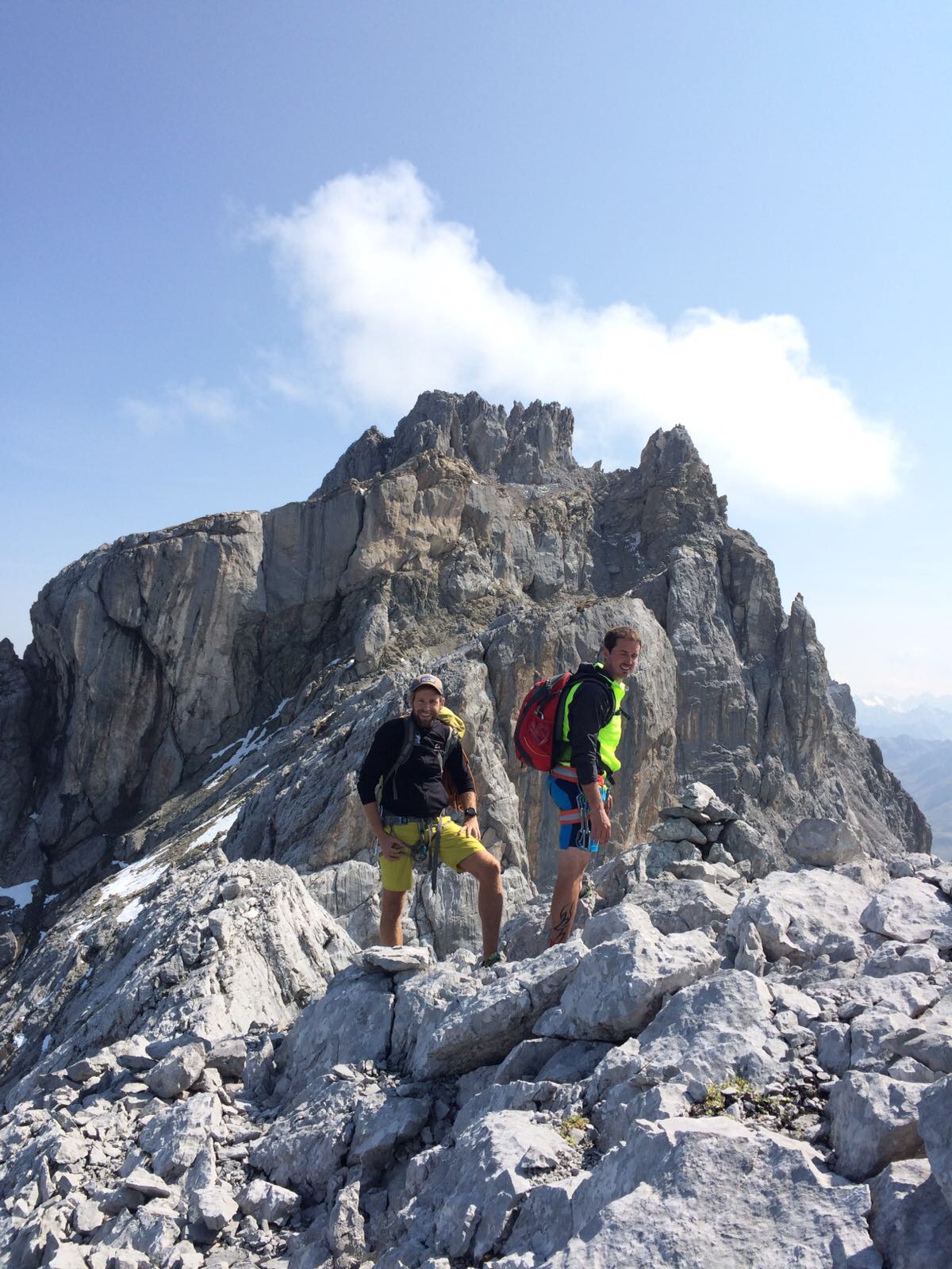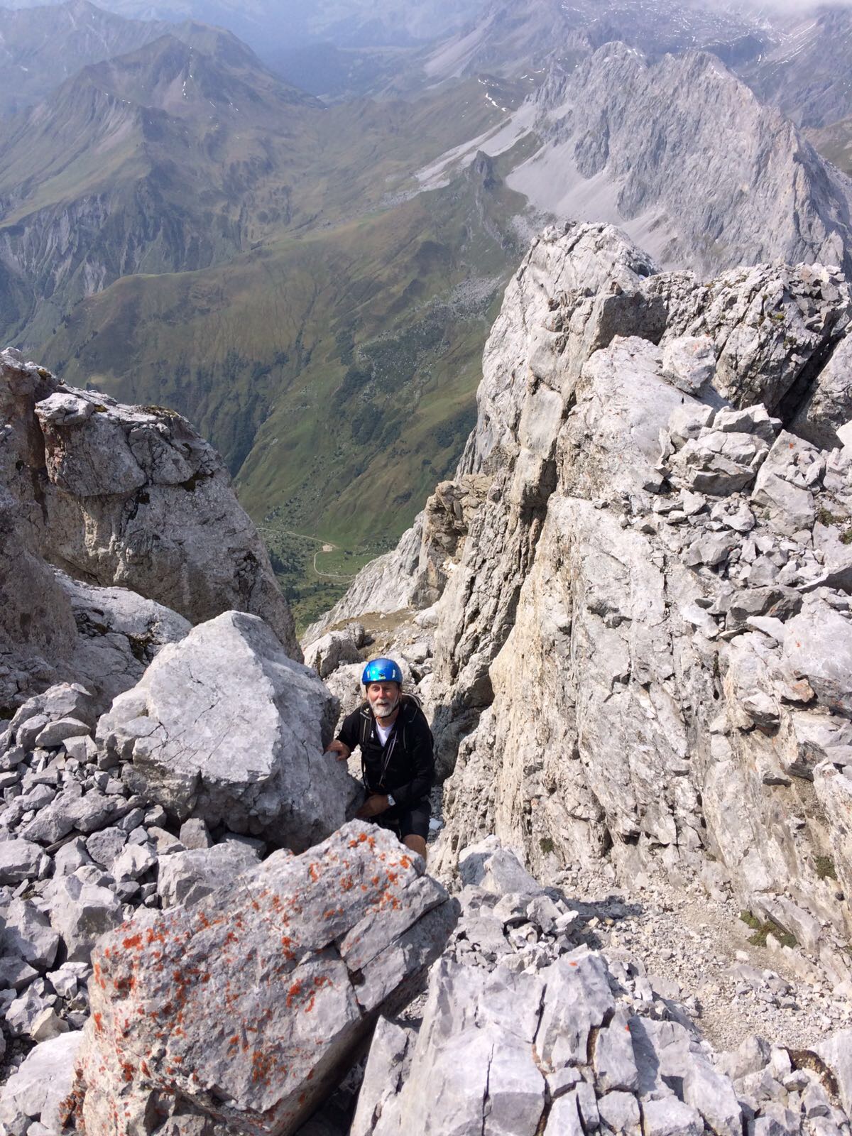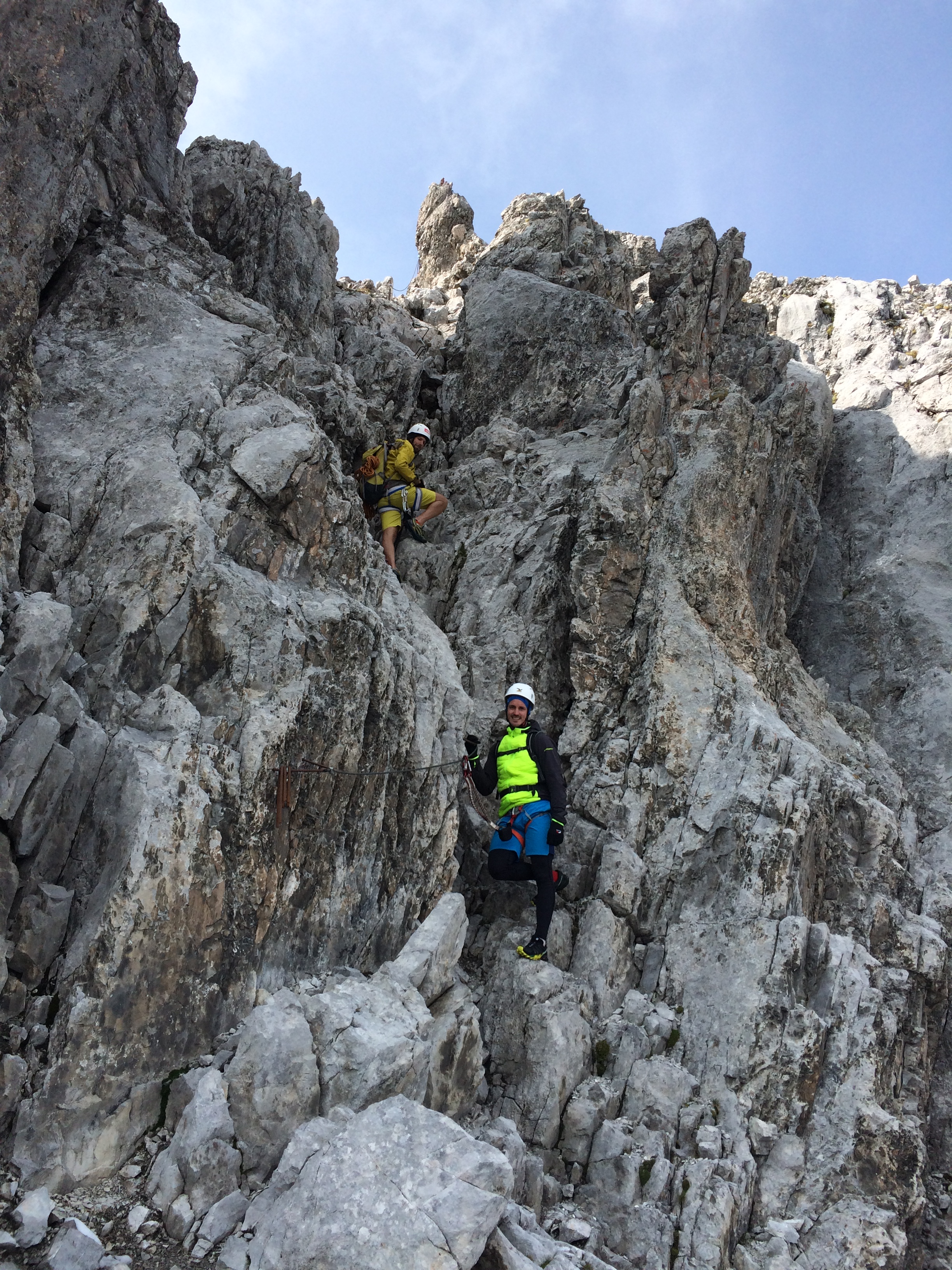 Ganz alleine dürfen wir die tolle Aussicht vom Gipfel genießen. Die Klettersteiggeher, die wir beim Aufstieg sehen konnten, scheinen schon wieder abgestiegen sein. Zügig steigen wir wieder ab und nutzen den Klettersteig in der Blodigrinne für den Abstieg.