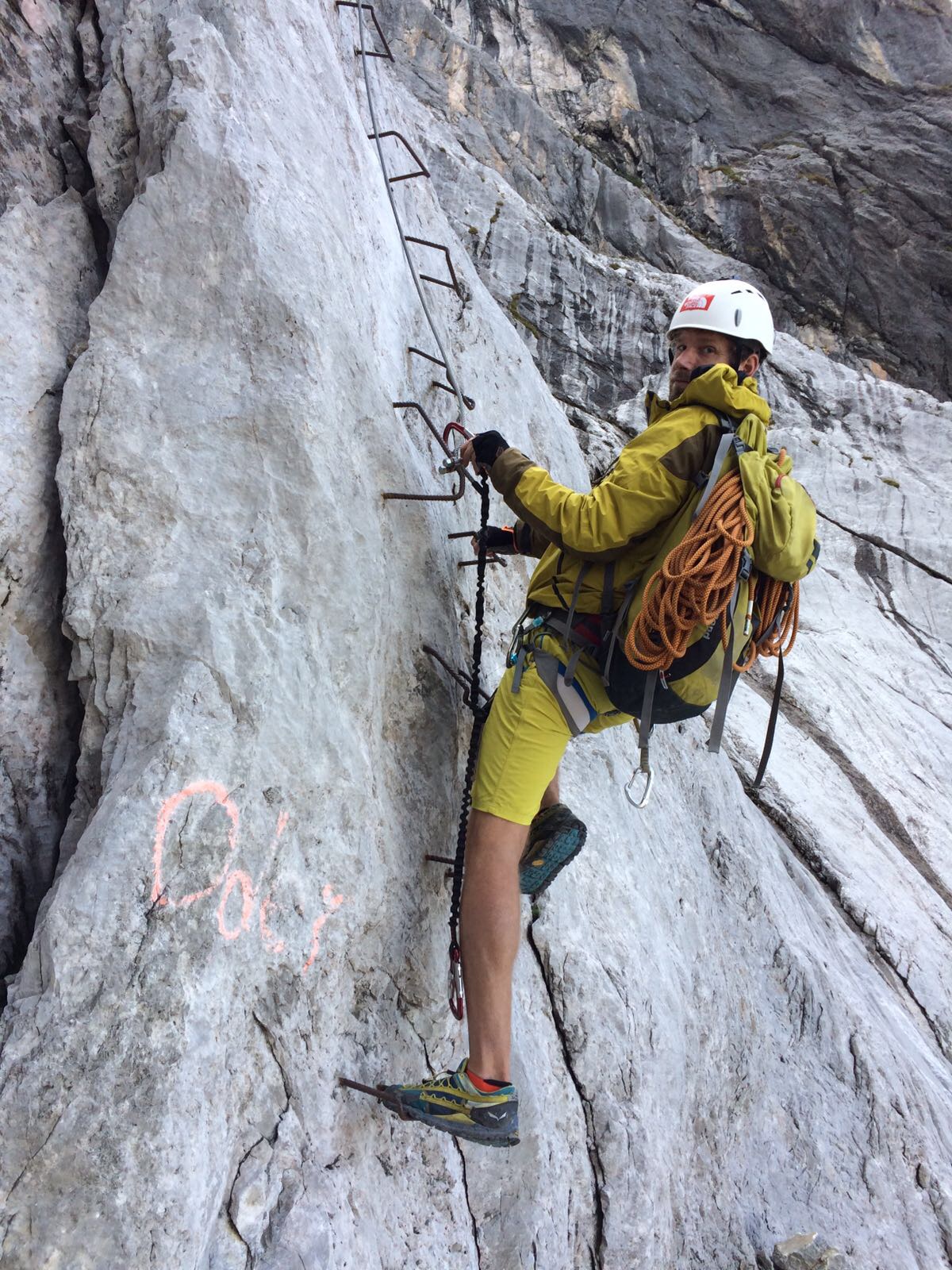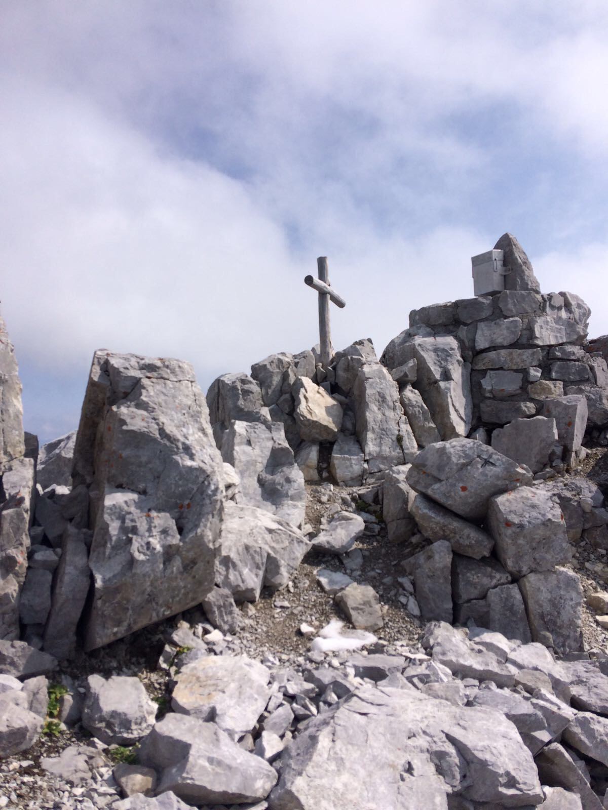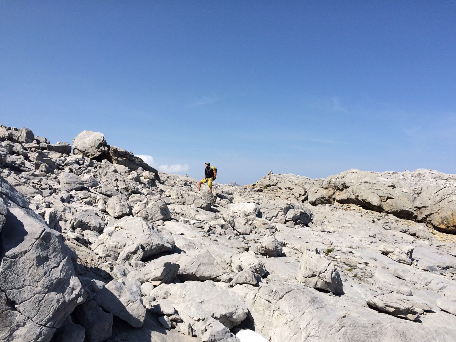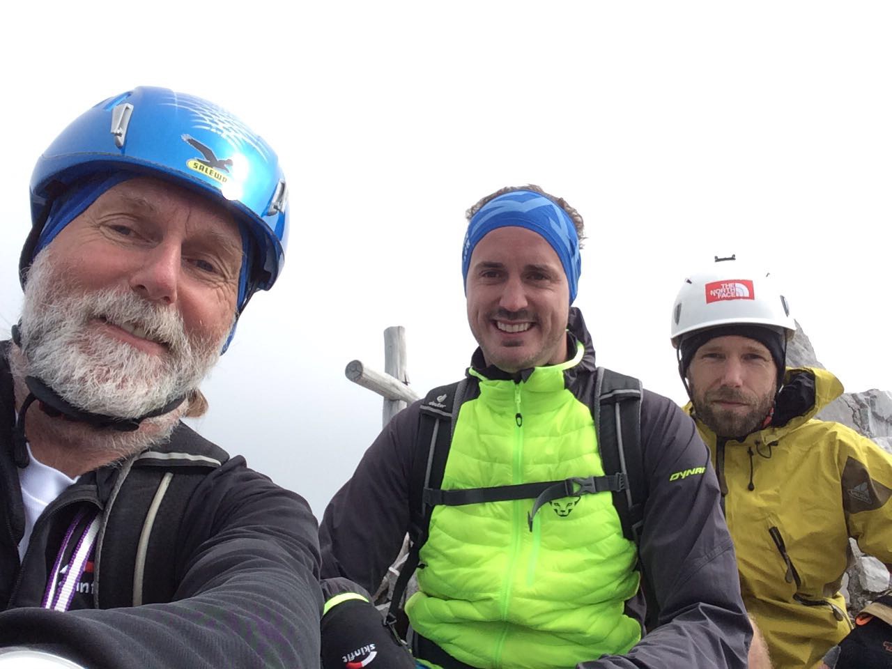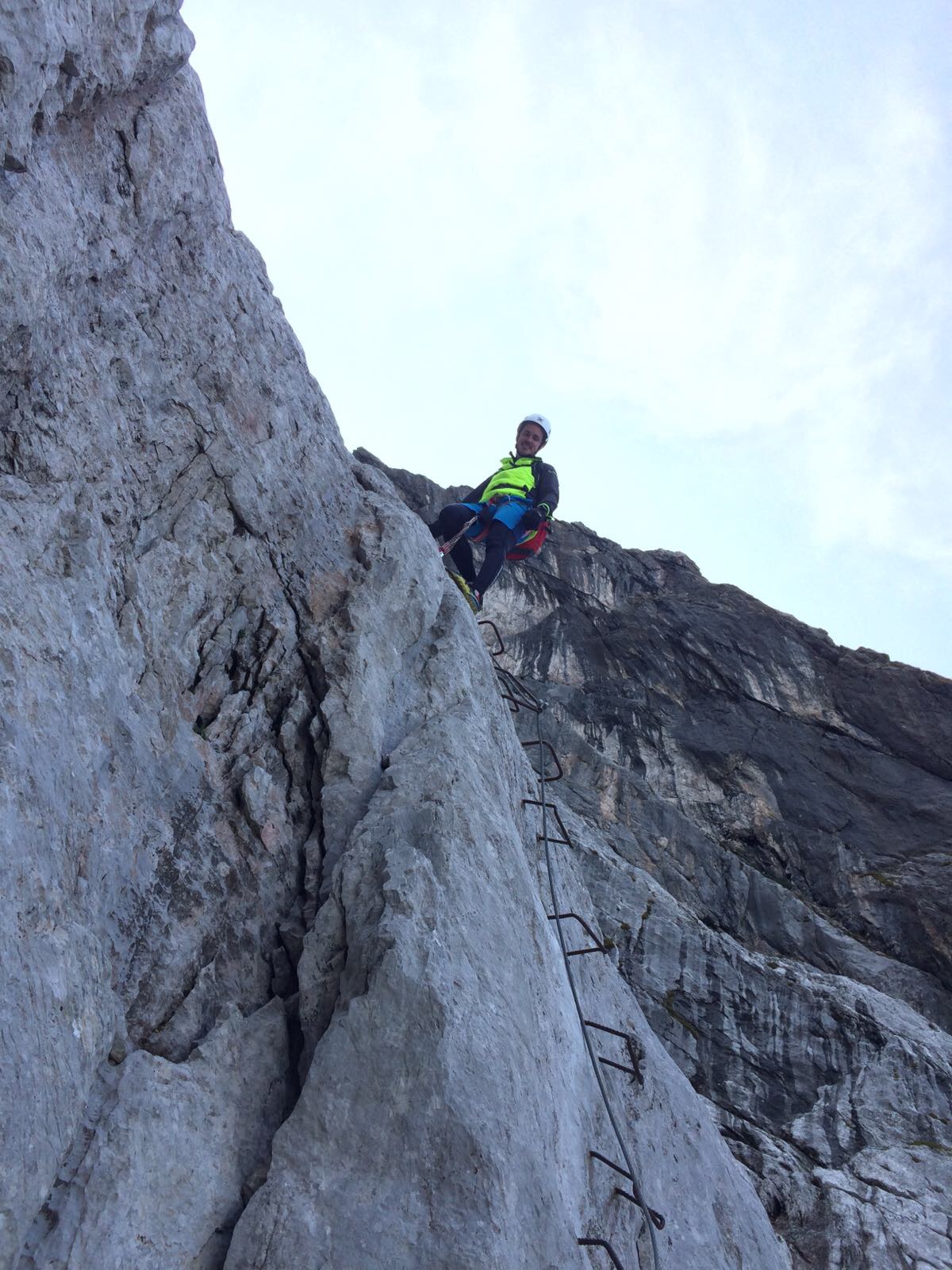 Ganz alleine dürfen wir die tolle Aussicht vom Gipfel genießen. Die Klettersteiggeher, die wir beim Aufstieg sehen konnten, scheinen schon wieder abgestiegen sein. Zügig steigen wir wieder ab und nutzen den Klettersteig in der Blodigrinne für den Abstieg.