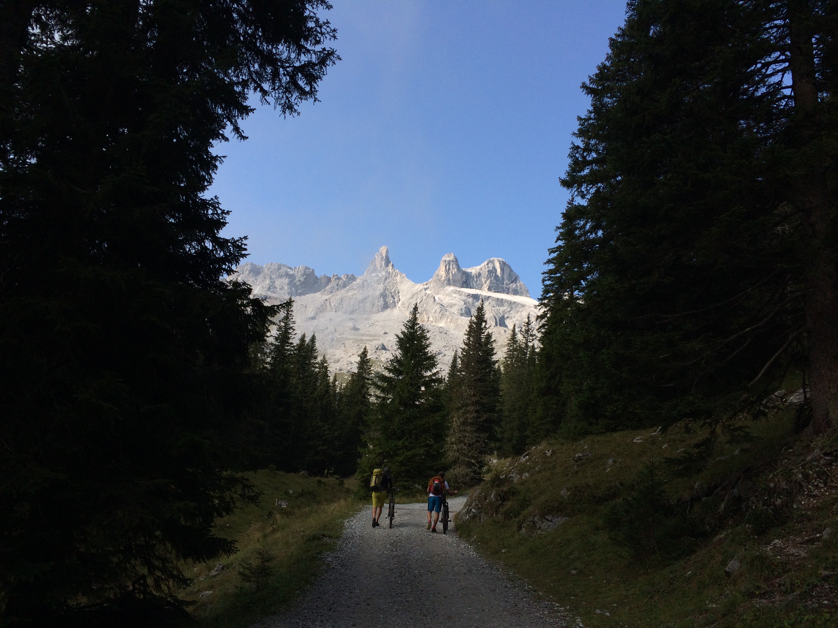 Der heurige Höhepunkt sollte die Hochtour am Gran Paradiso werden. Schon Anfang Woche waren die Wetteraussichten schwierig einzuschätzen und deuteten eher auf eine unsichere Wetterlage hin. Am Donnerstag dann die Entscheidung, die Tour muss auf nächstes Jahr verschoben werden. Das Wetterfenster am Gipfeltag war zu klein um eine Fahrt ins Aostatal auf sich zu nehmen. Der Wetterbericht versprach aber auf Freitag noch gutes Wetter im Ländle. Einige spannende Touren standen zur Diskussion. Schlussendlich setzte sich die Überschreitung der Drusenfluh durch, welche wir vor zwei Jahren über eine sehr interessante Route machten. Das Team halbierte sich jedoch auf Rigo, Andi und Björn.