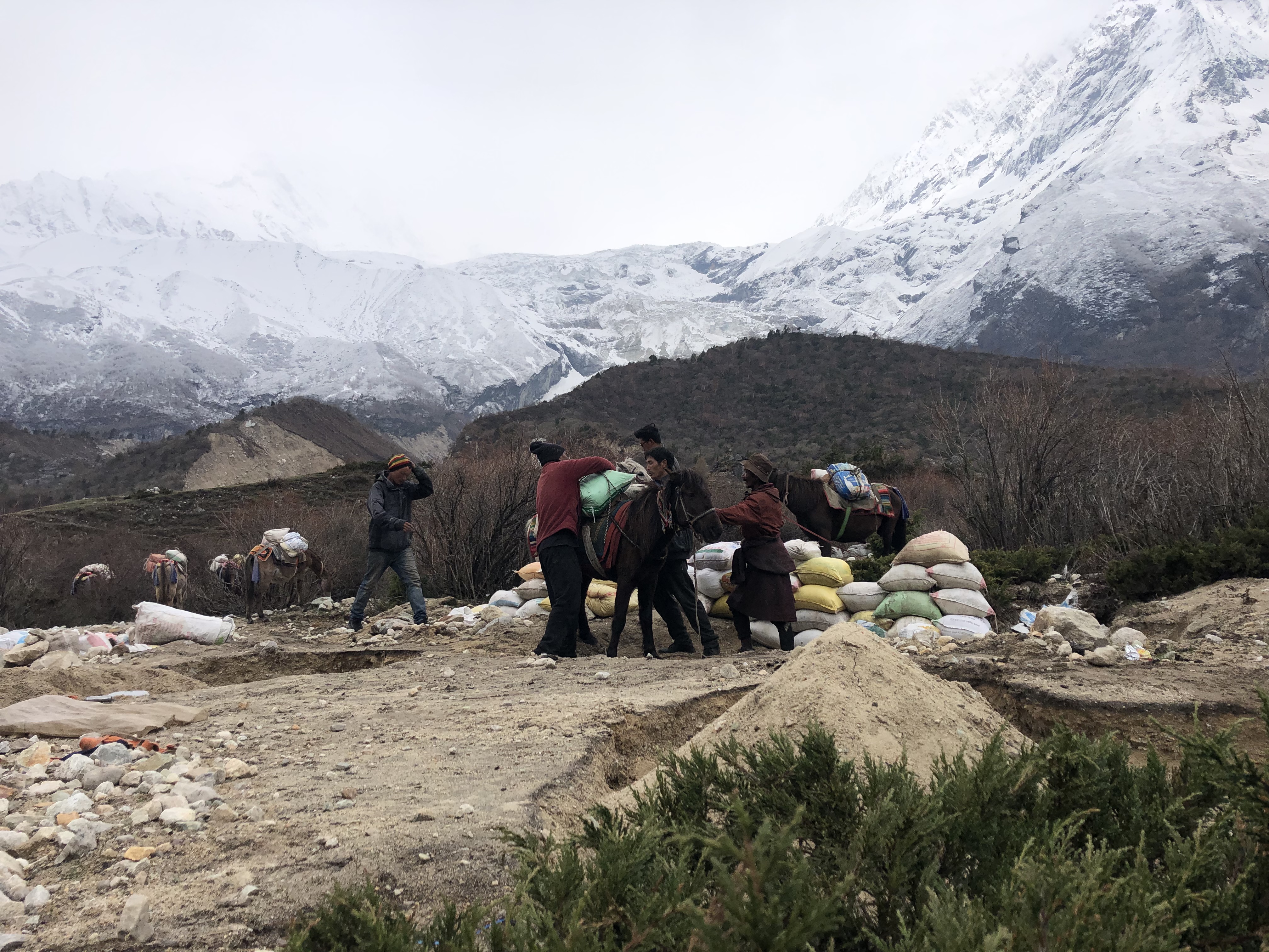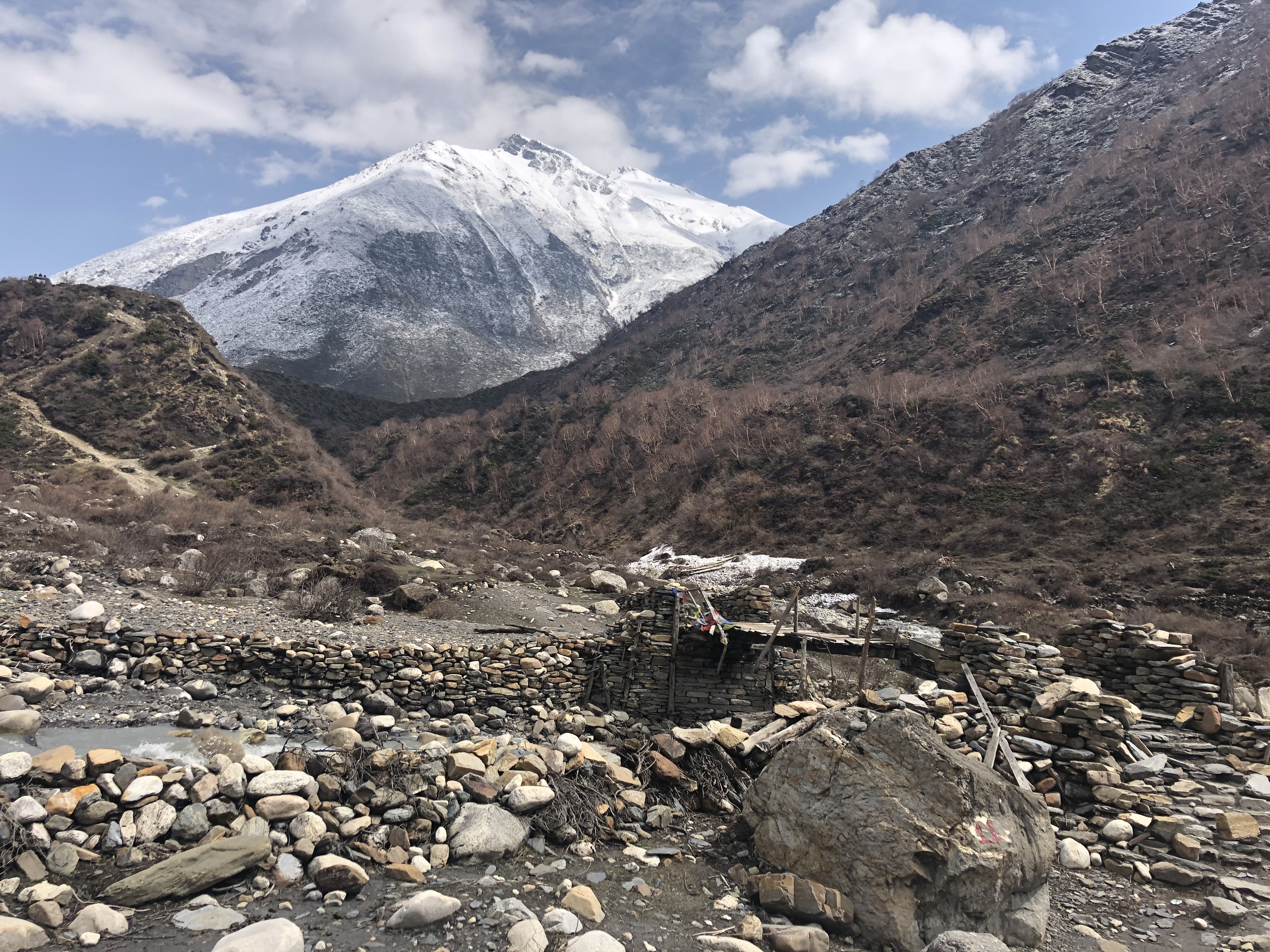 Letzte Nacht hatten wir Regen der später in Schneeregen überging. In der Dunkelheit war nichts zu erkennen, aber am heutigen Morgen sah man, wie weit es runtergeschneit hat. Die Berge zudem tief mit Wolken verhangen und wir waren nach dem Frühstück froh um unsere gute Kleidung. Etwas später als gewöhnlich zottelten wir heute los, denn die Etappe war mit 3 Std Richtung Samdo doch sehr überschaubar.
