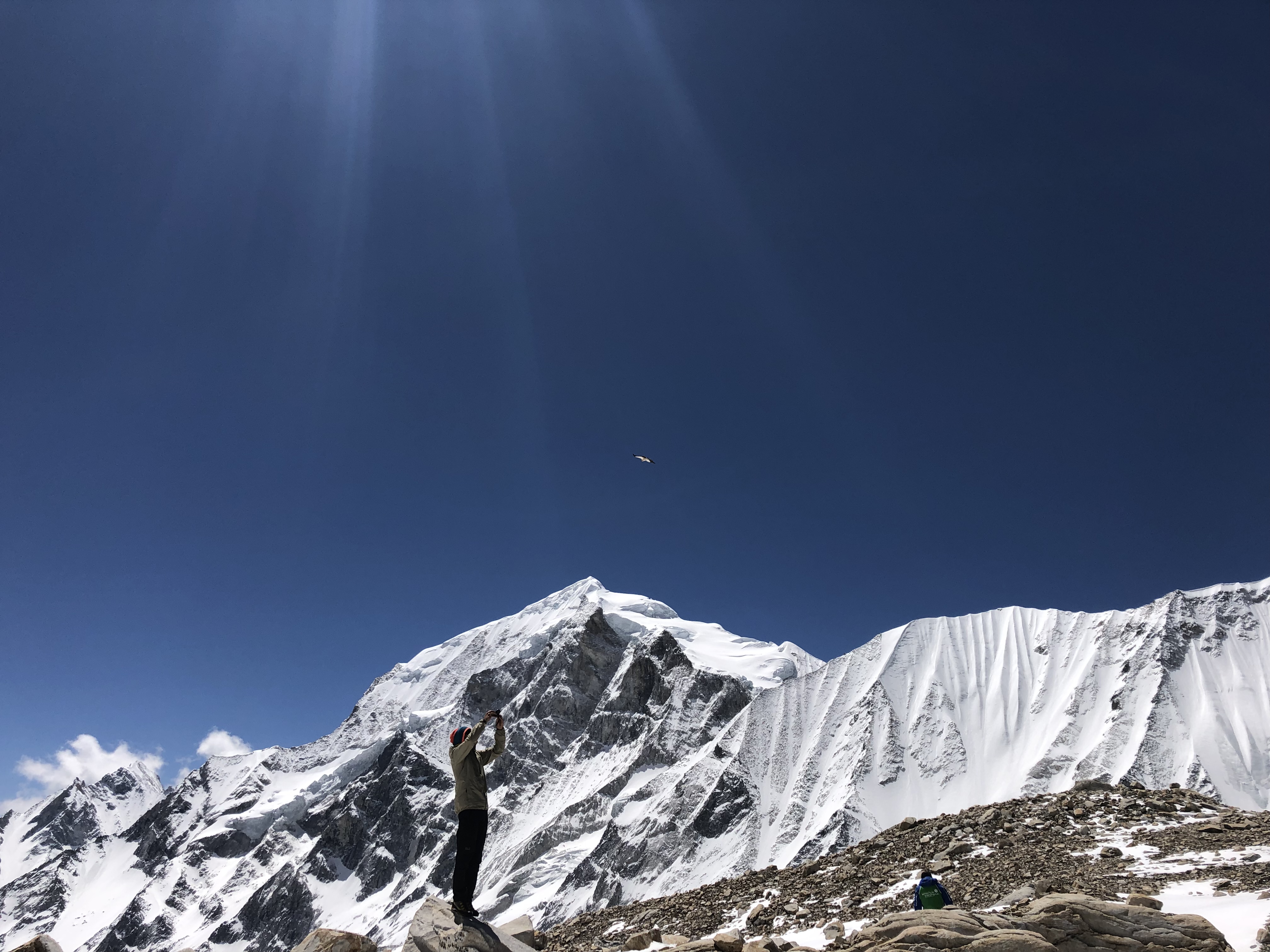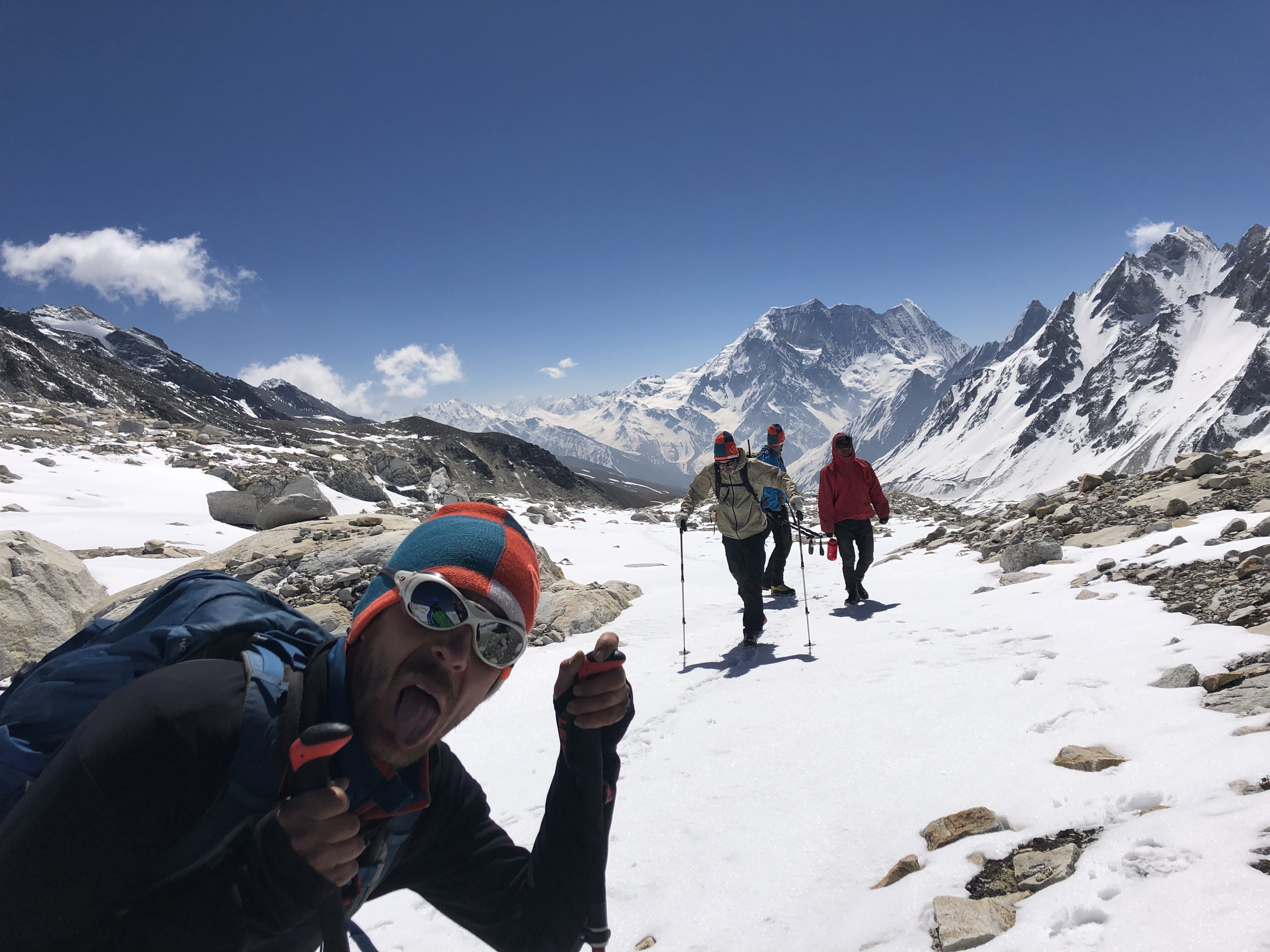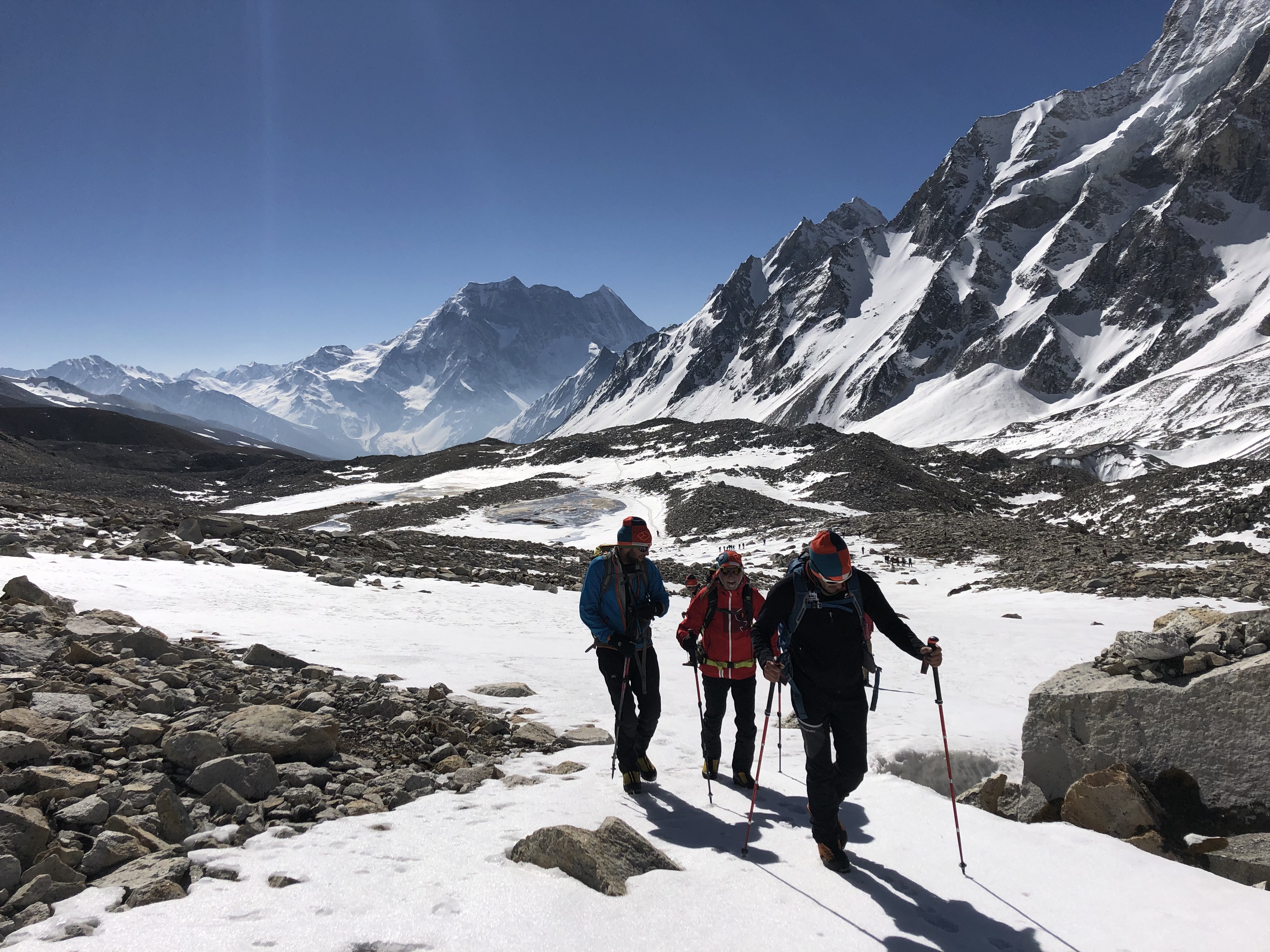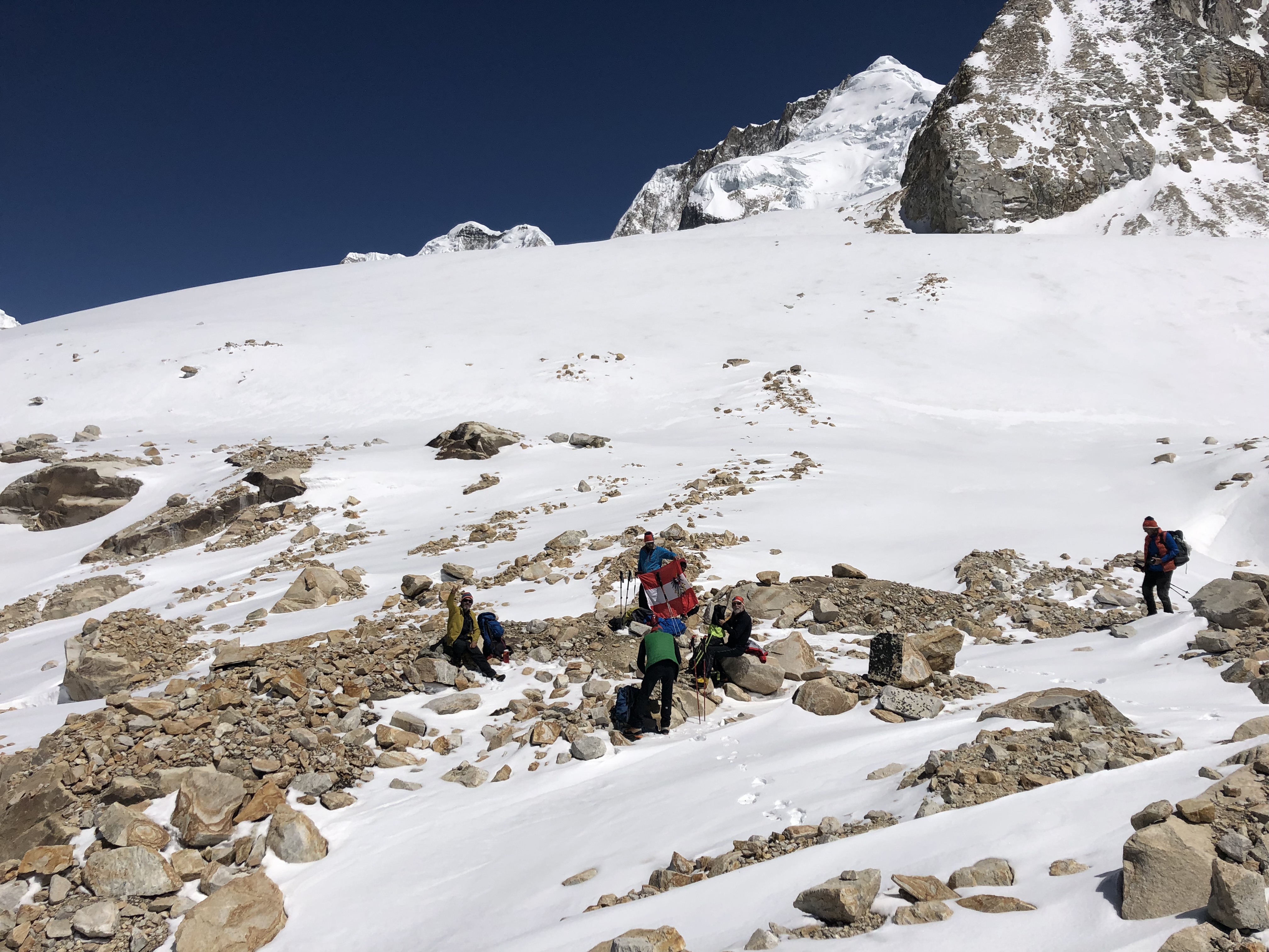 Zurück im Camp, war das Essen unter freien Himmel schon parat. Wir genossen es, bis wir von einem dumpfen Grollen aufgeschreckt wurden. Eben genau in der Route, die uns zum Aufstieg auf den Larky Peak gedient hätte, löste sich von einem Gletscher über einer Querung ein großer Teil und ging mit Getöse auf die Aufstiegsspur nieder. Der Aufenthalt darunter wäre mit Sicherheit tödlich gewesen, kein Entrinnen! Im besten Fall wären die Fixseile weggerissen gewesen und der Abstieg dadurch sehr heikel gewesen.